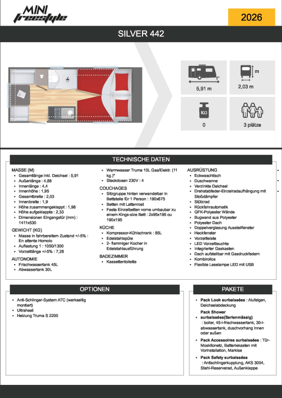 Sie reisen oft mit Familie und/oder Freunden und wünschen etwas mehr Komfort? Dann ist der SIlver Mini 442 genau das Richtige für Sie! Dieser geräumige und komfortable Wohnwagen bietet enormen Gestaltungsspielraum, besonders was die Schlafplätze anbelangt.
