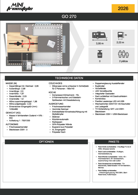 Der MINI FREESTYLE 270 wurde für den Abenteuerfan mit dem Hang zu spontanen Camping Trips entwickelt und verbindet Komfort und Zweckmäßigkeit in besonders gelungener Weise.