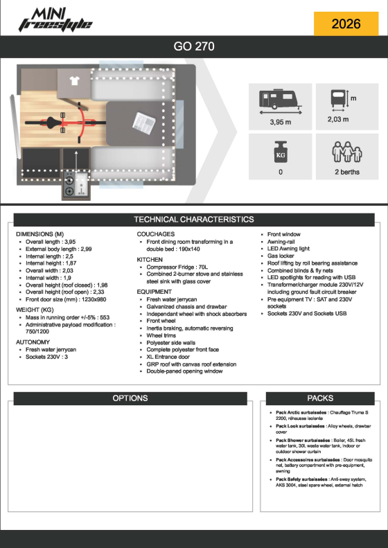 The MINI FREESTYLE 270 is designed for fans of adventure and impromptu camping trips, combining comfort and practicality to satisfy all your needs.Easy to two and store, its functionality will leave you speechless.
