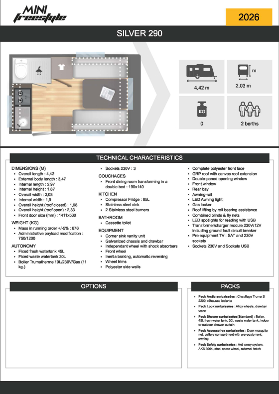 Compact and lightweight, The MINI FREESTYLE 290 is fitted with a bathroom with WC and wash basin.The kitchen is located at the rear while the lounge area is easily transformed into comfortable double bed.