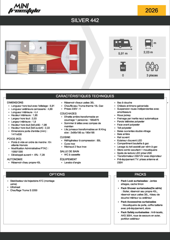 Vous voyagez souvent en famille et/ou entre amis et vous voulez améliorer votre confort ? La Silver Mini 442 est faite pour vous ! Spacieuse et confortable, vous pourrez moduler cette caravane à toutes vos envies surtout au niveau des couchages.