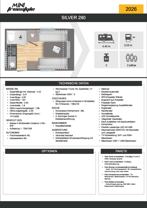 De compacte en lichte, MINI FREESTYLE 290 is uitgerust met een badkamer met toilet en wastafel. De keuken bevindt zich aan de achterzijde en de zitgroep kan gemakkelijk worden omgevormd tot een comfortabel 2-persoons bed.